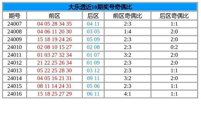 首先我们先来回顾一下上期的大乐透开奖。体彩大乐透第24016期奖号开出:15 18 25 27 29 + 06 11,其中5个前区号码的奇偶比为4:1,2个后区号码的奇偶比为1:1。