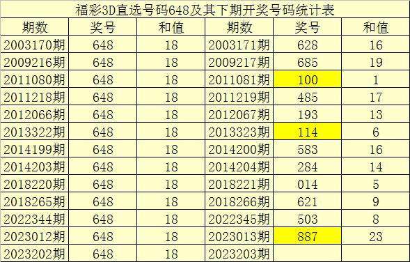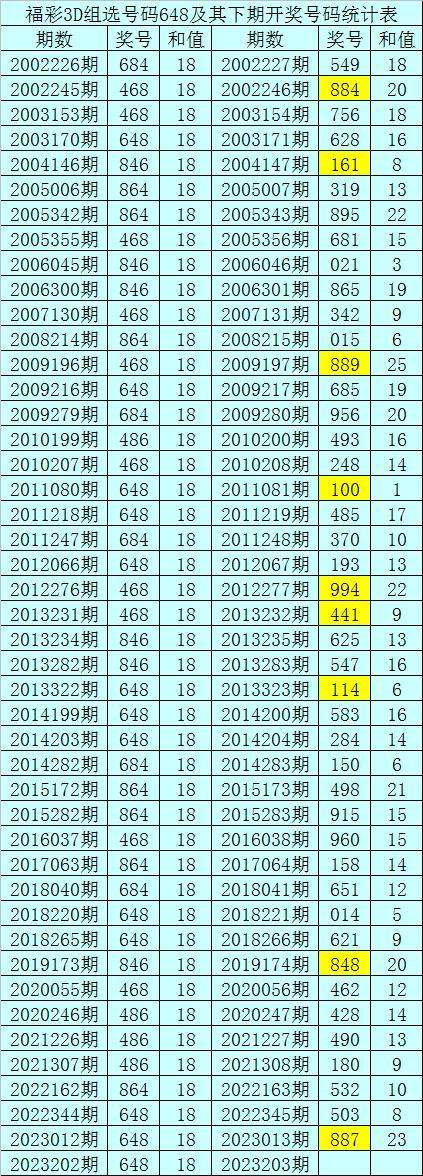 二、组选分析:历史上组选号码648开出了45次,其下期奖号分别为:549-884-756-628-161-319-895-681-021-865-342-015-889-685-956-493-248-100-485-370-193-994-441-625-547-114-583-284-150-498-915-960-158-651-014-621-848-462-428-490-180-532-503-887,其开出期数和下期奖号统计为: