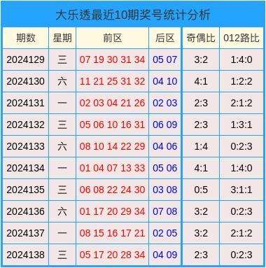 开奖回顾:第2024138期大乐透开奖号码为:05、17、20、28、34+04、09。奇偶比为2:3,012路比为0:2:3。