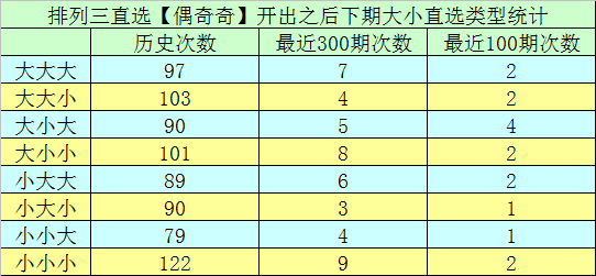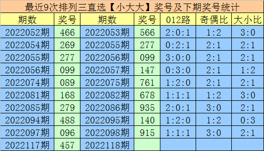 1。排列三第2022117期奖号开出457,大小直选分布为:小大大,在历史开奖中直选【小大大】分布已开出772期,在前9次直选【小大大】分布中,出现奖号为:466-269-277-099-089-168-279-488-096,组三开出4期,组六开出5期。