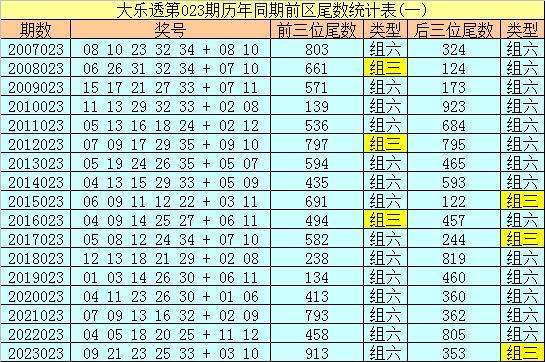 在大乐透第023期历年同期奖号中,前区后三位尾数出号频次分别为:尾数3、4出现8个,尾数2出现7个,尾数5出现6个,尾数6出现5个,尾数1、9出现4个,尾数0、7、8出现3个。其中尾数数字三类型豹子、组三、组六次数比为0:3:14,今年同期后三位尾数类型参考组六;