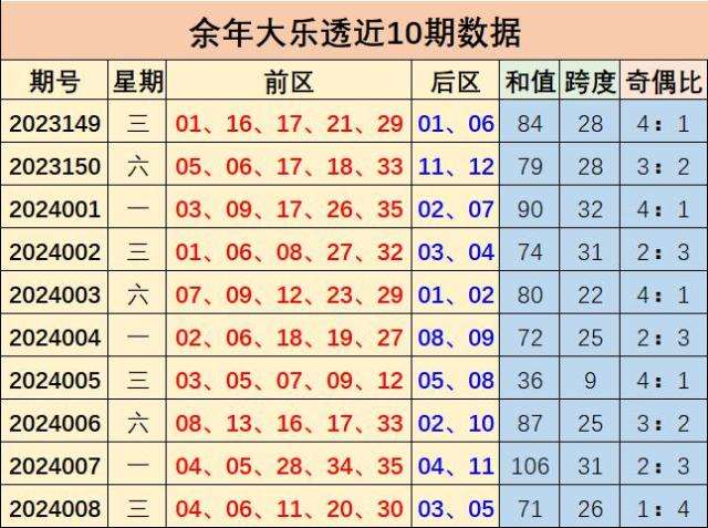 大乐透第2024008期出奖号统计:前区04 06 11 20 30,后区03、05,和值为71,跨度26,龙头04凤尾30,三区比为3:1:1,012路比为2:1:2,奇偶比为1:4,大小比为2:3,冷热比为3:2,1枚重号,0组连号。