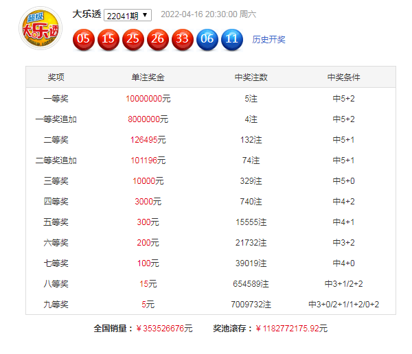 上期开奖:体彩大乐透第22041期开奖号码:05 15 25 26 33+06 11,前区和值:104,跨度:28,奇偶比:4:1,大小比:3:2,五区比:1:0:1:2:1,开出1个重号:25。