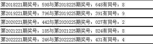 与前期历史同期奖号对比分析,在最近五年开奖中,第221期同期奖号与第225期同期奖号都出现了相同号码:
