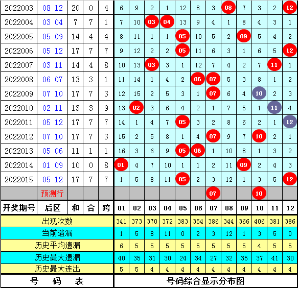 5、前区012路比分析:前区上期奖号012路比为2:1:2,本期看好1路号码热出,预计012路比为1:3:1。