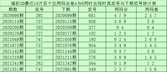 百个位合差分析:上期奖号百个位开出77组合,两码合为4,两码差为0,最近10次百个位两码合4与两码差0同时出现时,其奖号和下期奖号分别为: