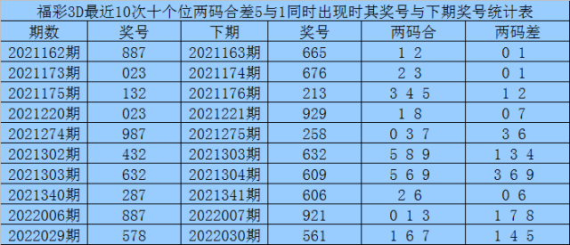 从以上统计可以看出,十个位两码合差5与1同时出现之后其下期两码合差表现最热的4个分别为:0136,本期十个位两码合差可以参考这四码中的数据。