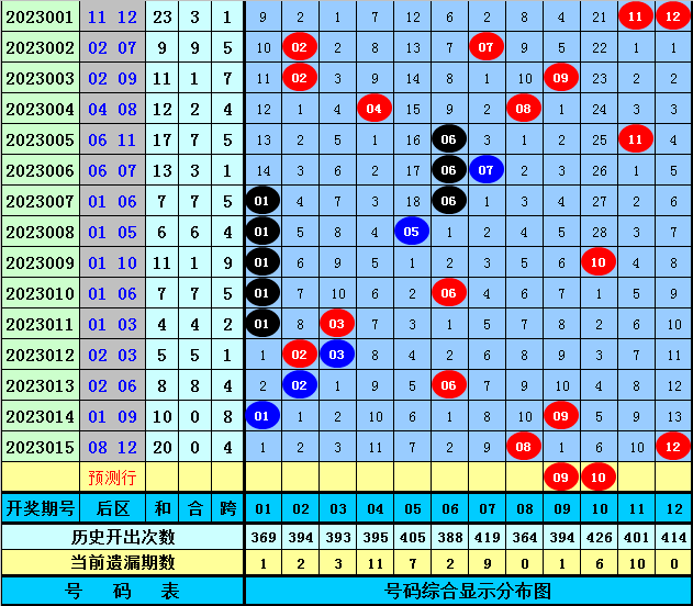 前区三区分析(一区:01-12段,二区13-23段,三区24-35段):最近50期一区共开出92枚奖号,二区共开出81枚,三区共开出77枚,总体来看红一区略占优势;近10期前区三区比为22:13:15,总体上一区奖号表现优势;上期前区三区比为1:1:3,其中3:1:1。