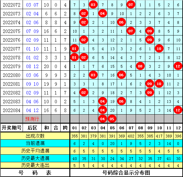 1、前区和值分析:上期前区和值开出85,对比第2022083期和值下降了1点,本期预计和值继续下降,预计开出50-60之间和值。