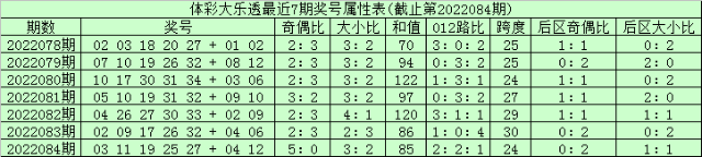 上期回顾:体彩大乐透第2022084期开奖号码为:03 11 19 25 27 + 04 12,前区号码奇偶比为5:0,大小比为3:2,和值为85,012路比为2:2:1,跨度为24,后区号码奇偶比为0:2,大小比为1:1。