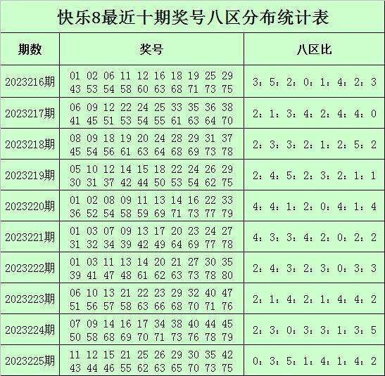 福彩快乐8第2023225期开奖回顾:11 12 15 21 25 26 29 30 35 42 43 44 46 55 62 63 65 70 73 75,其中奖号八区比为0:3:5:1:4:1:4:2。