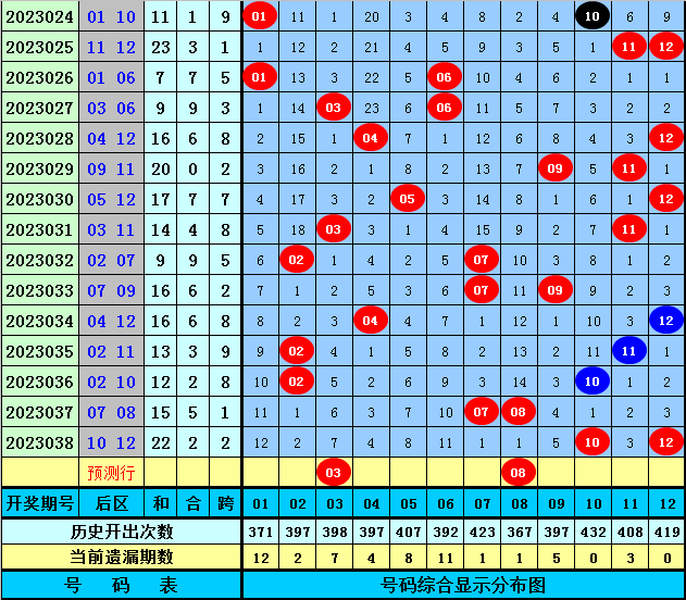 大乐透第2023038期开出奖号为04、10、18、27、32+10 12。其中前区奇偶比为1:4,三区比为2:1:2,大小比为3:2,后区为全大组合。