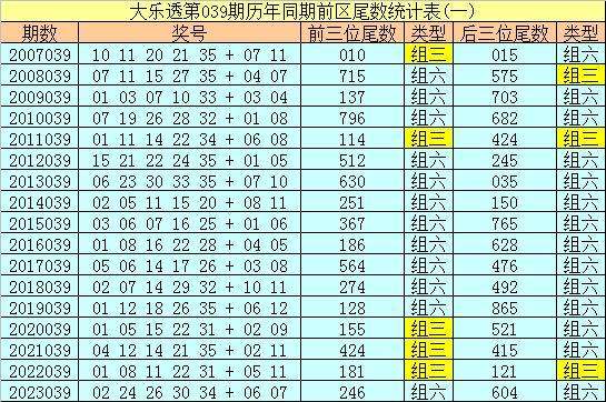 在大乐透第039期历年同期奖号中,前区前三位尾数出号频次分别为:尾数1出现12个,尾数2、4、5、6出现6个,尾数7出现5个,尾数0、3、8出现3个,尾数9出现1个。其中尾数数字三类型豹子、组三、组六次数比为0:5:12,今年同期前三位尾数类型参考组六;