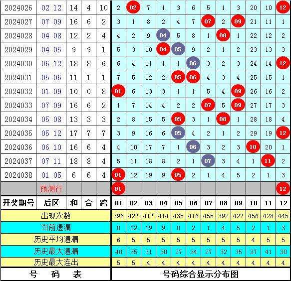 大乐透历年同期第039期后区尾数奇偶比为18:16,最近5年尾数奇偶比为5:5,后区尾数大小比为16:18,最近5年尾数大小比为5:5,本期后区注意号码01、02、06、09、12,后区两码关注01、12。