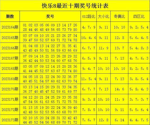 福彩快乐8第2023173期开奖回顾:02 10 15 20 24 28 31 32 42 43 44 45 52 54 56 68 69 70 71 72,其中奖号012路比为7:6:7,和值为848,跨度为70,奇偶比为6:14。