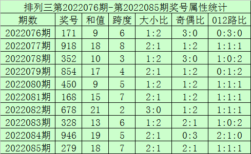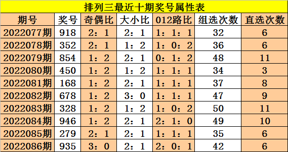 上期回顾:体彩排列三第2022086期奖号:935。,奇偶比3:0,大小比2:1,012比2:0:1。