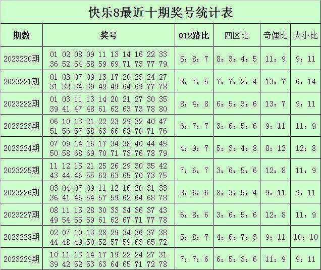福彩快乐8第2023229期开奖回顾:10 11 13 14 17 19 22 24 27 31 39 42 52 53 63 64 65 71 72 78,其中奖号012路比为7:7:6,四区比为6:5:3:6,奇偶比为11:9,大小比为9:11。