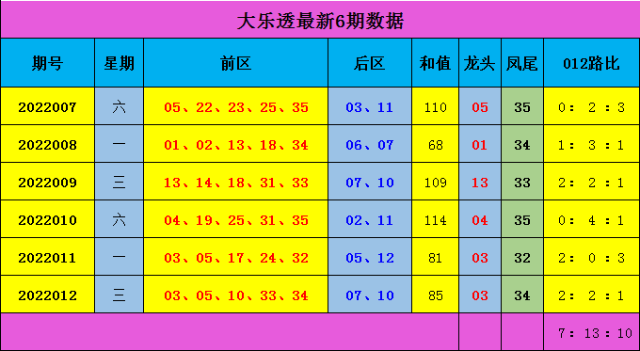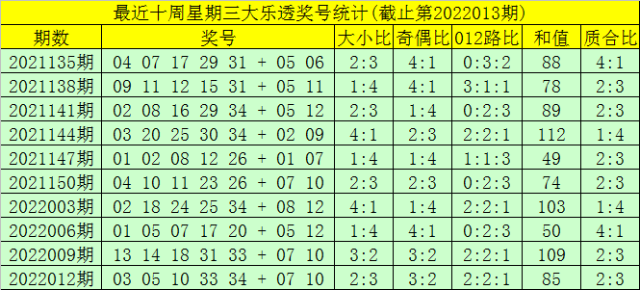 第一区(01-07):最近10周星期三开出了13个奖号,其中号码02出现3次;01、03、04、05、07出现2次;号码06没有出现;