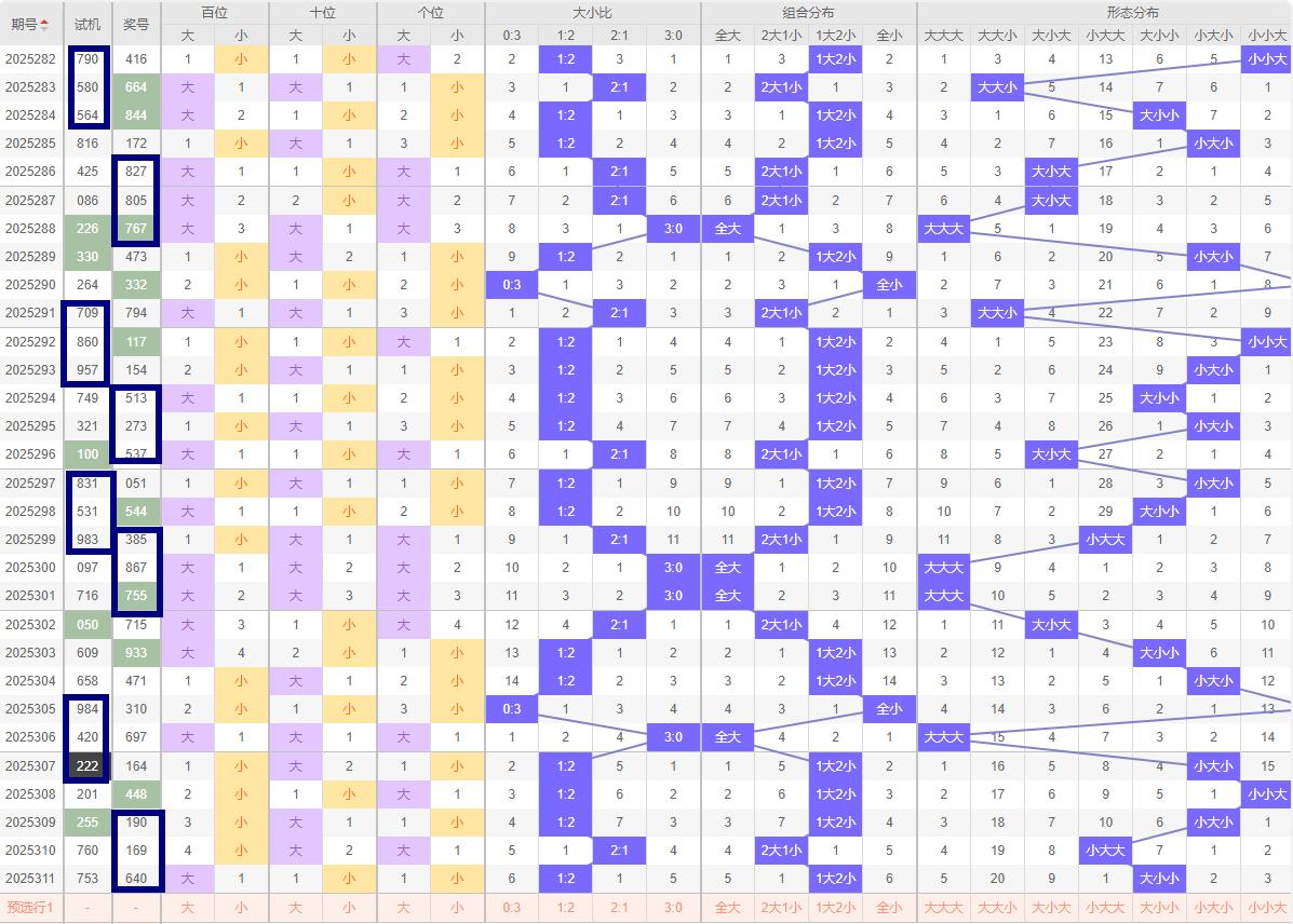 大小走向分析: 在福彩3D中,大小走势是判断号码分布的重要依据。根据311期开奖结号码为640,大小比为1:2;形态偶偶偶形态。结合历史走势图,发现近10期大小比例为13:17,小数占据绝对优势;因此,312期关注的大小比例可以是2:1或者1:2,可能会出现二个大奖号和一个小奖号,应充分考虑这一趋势,合理分配投注比例。防全大号码.