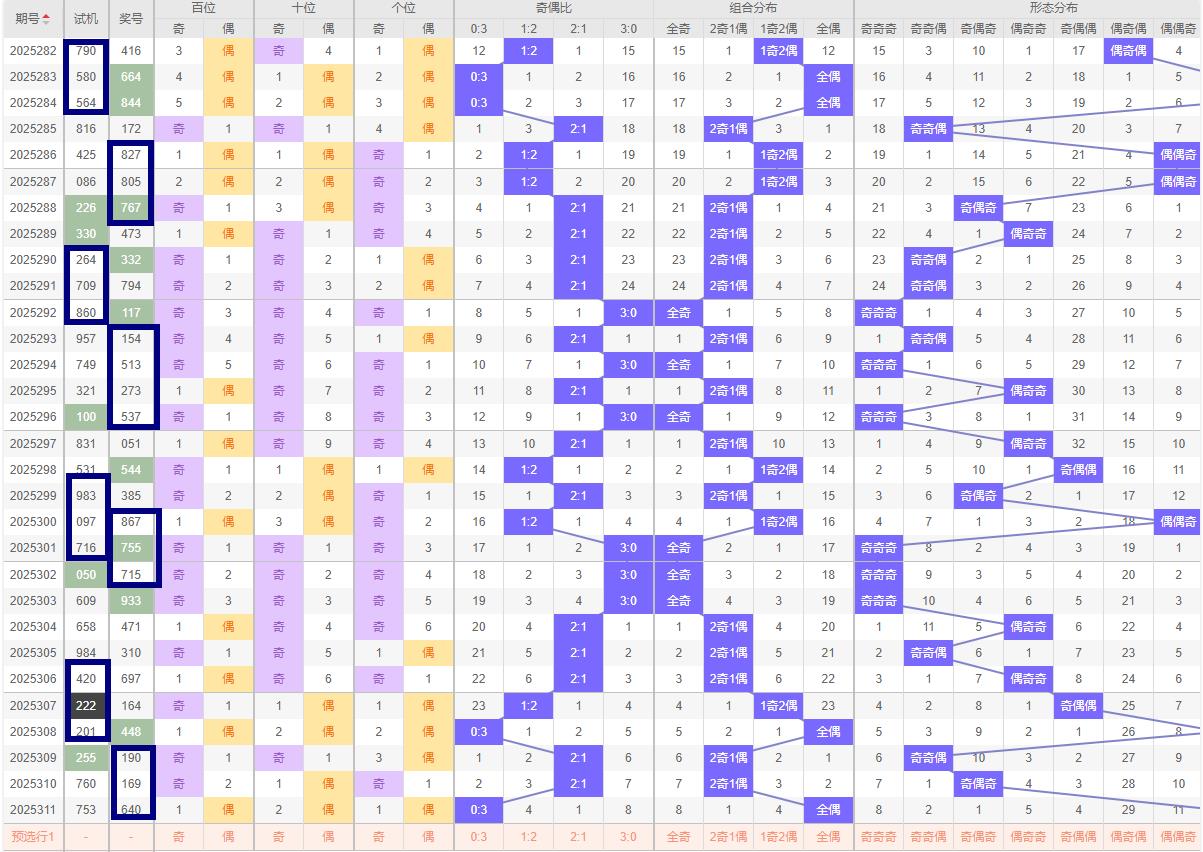 奇偶比例分析 奇偶比例同样是福彩3D分析中的重要一环。311期开奖号码为640奇偶比为0:3。从近期走势图来看,奇偶比例分布较为均衡,没有出现明显的偏态。因此,本期可以关注1:2或者2:1的奇偶比例。可以根据这一比例进行号码筛选。近十期奇偶比为17:13.关注两偶一奇号码