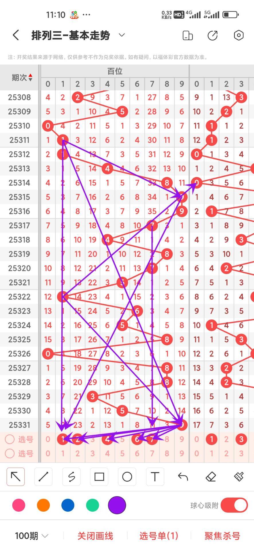 2025332期上期百位开出奇数9,我们通过走势图来看百位上100期,0-9下号数据和最大遗漏数据,其中0出现10次,1出现14次,2出现8次,3出现7次,4出现7次,5出现14次,6出现9次,7出现10次,8出现11次,9出现10次,0-9目前5出现的最多14次,我们在回过头来看最大遗漏下号,0遗漏32次,1遗漏13次,2遗漏23次,3遗漏29次,4遗漏31次,5遗漏52次,6遗漏23次,7遗漏35次,8遗漏29次,9遗漏35次,目前遗漏中5遗漏最大52次,通过上面的走势分析我们可以看出目前百位上走势比较好的号码是0路,热号是02路号码我们可以关注下,247号码走势就有点冷淡,我们可以防守,今天百位我们重点关注12467,具体看下面走势图