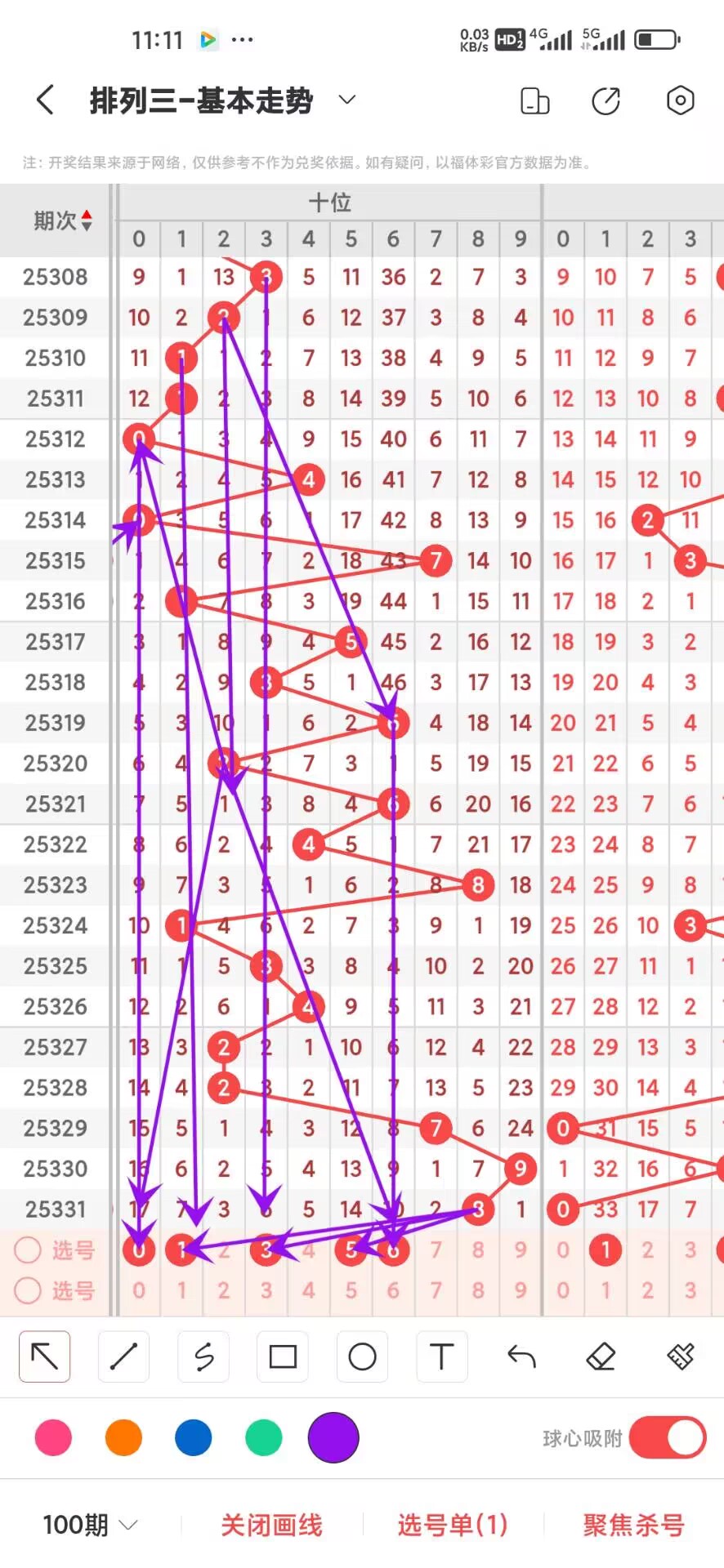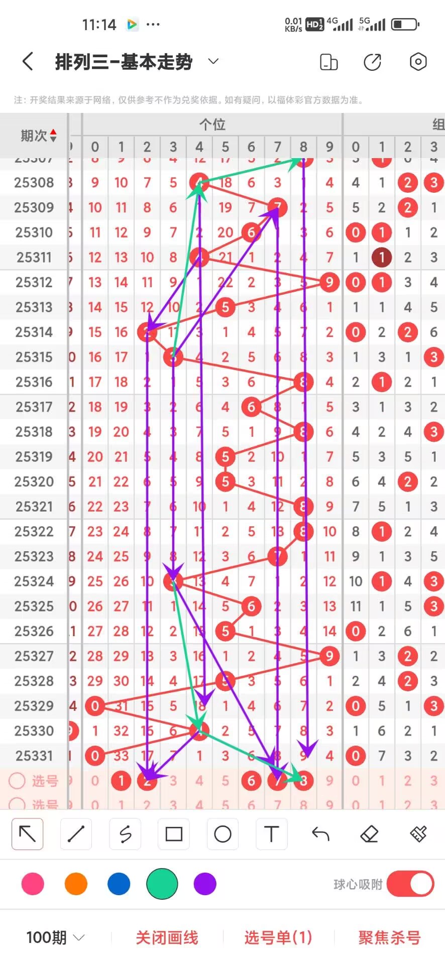 2025332期上期个位开出偶数0,我们通过走势图来看百位上100期,0-9下号数据和最大遗漏数据,其中0出现8次,1出现7次,2出现14次,3出现12次,4出现11次,5出现10次,6出现7次,7出现15次,8出现15次,9出现4次,0-9目前0169出现的最少,我们在回过头来看最大遗漏下号,0遗漏29次,1遗漏33次,2遗漏18次,3遗漏36次,4遗漏27次,5遗漏45次,6遗漏26次,7遗漏20次,8遗漏19次,9遗漏54次,目前遗漏中9遗漏最大54次,通过上面的走势分析我们可以看出目前个位上走势比较好的号码是568,热号是568号码我们可以关注下,12号码走势就有点冷淡,我们可以防守,今天个位我们重点关注12678,具体看下面走势图