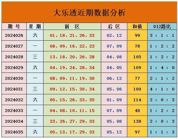 上期回顾:大乐透第2024035期奖号:前区05、13、17、29、33,后区05、12,前区奖号和值为97,三区比为1:2:2,后区开出小大组合05、12