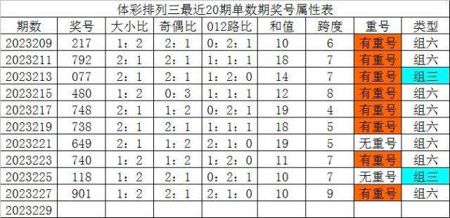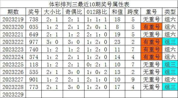 体彩排列三最近10期分别开出奖号:738、035、649、977、740、374、118、535、901、773,各奖号属性详见下表: