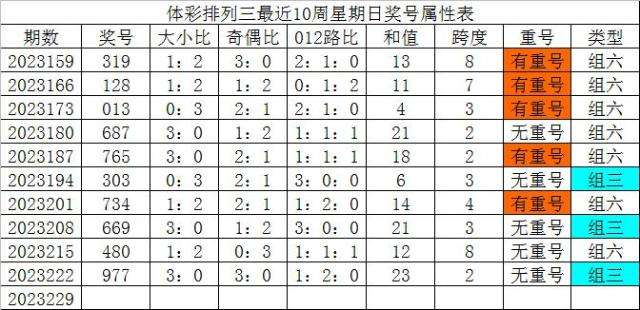 体彩排列三最近10周星期日奖号分别为:319、128、013、687、765、303、734、669、480、977,各奖号属性详见下表: