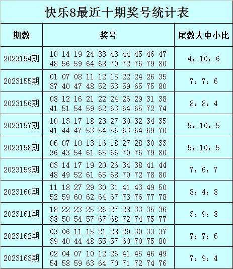 福彩快乐8第2023163期开奖回顾:02 04 07 10 12 26 41 45 46 49 54 58 59 63 64 70 71 72 74 76,其中包含7个小尾奖号:02、10、12、41、70、71、72;包含9个中尾奖号:04、26、45、46、54、63、64、74、76;包含4个大尾奖号:07、49、58、59。