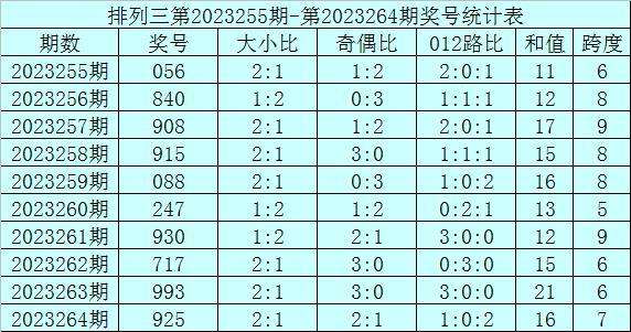 上期回顾:排列三第2023264期奖号为925,奖号012路比为1:0:2,奇偶比为2:1,大小比为2:1,和值为16,跨度为7。