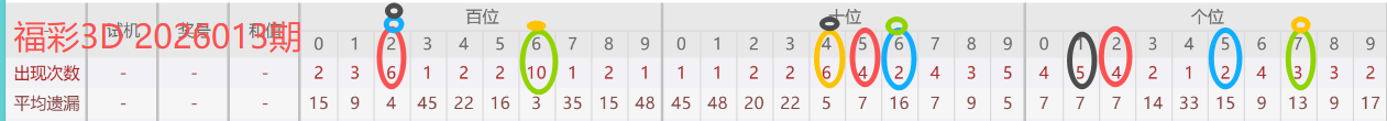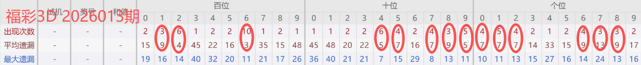 2026011期开奖号码647,我们可以看出近30期百位6出现10次,十位4出现5次,个位7出现3次。