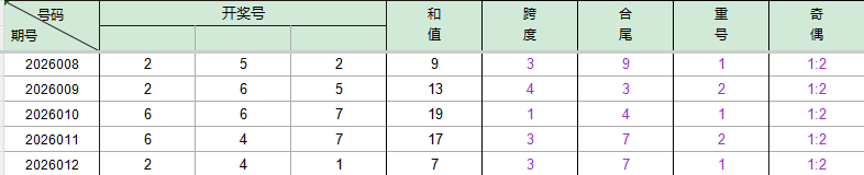 2026008期开奖号码252,我们可以看出近30期百位2出现5次,十位5出现4次(较010期减一),个位2出现4次(较009期减一)。