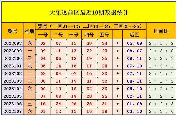 上期回顾:大乐透第2023107期:前区01、12、15、16、18,后区03、10,前区奖号三区比为2:3:0,后区开出奇偶组合03、10