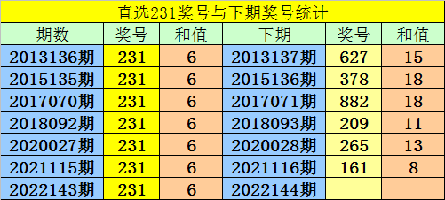 第2022143期3D奖号为:231,历史上该号码直选开出7次,下期号码分别为:627、378、882、209、265、161。