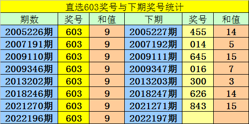 第2022196期3D奖号为:603,历史上该号码直选开出8次,下期号码分别为:455、014、645、016、300、626、843。