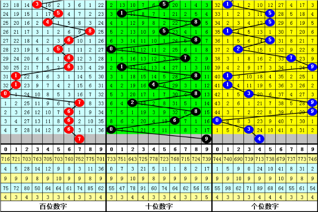 其中,号码0出现16次,1出现18次,2出现14次,3出现12次,4出现15次,5出现16次,6出现13次,7出现10次,8出现15次,9出现15次,奇偶比为71:73,奇偶号码基本持平,本期预计奇数热出,奇偶比参考2:1;大小比为:69:75,大号出现频次较低,本期注意大号回补。
