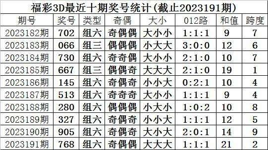 开奖回顾:福彩3D第2023191期奖号为768,奖号形态为:组六、大大大、1:1:1、奇偶偶。
