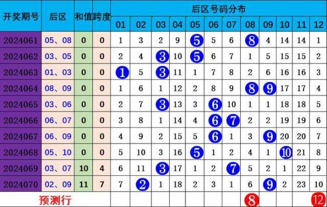上期开出后区号码:02 097,冷热组合。冷热分析:近十期,冷热比6:14,冷码出数较少,综合分析,本期预测冷冷组合后区回补,关注号码:07 08 09 11 12。精准推荐:08 12。