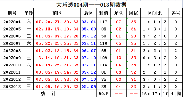 上期回顾,大乐透第2022013期开奖,本期奖号:前区04 09 16 25 32;后区05 06,当期前区号码大小比为2:3,三区比2:1:2,奇偶比为2:3。前区未开出连号,未开出重号。