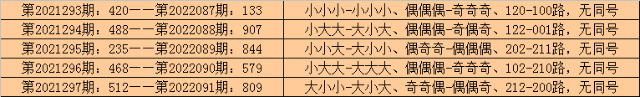 在排列三历史开奖中,第2021293期-第2021297期连续5期奖号为:420-488-235-468-512。