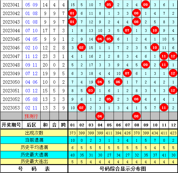 第二区(08-14):最近10周星期一开出了8个奖号,其中号码08出现3次;09出现2次;10、11、13出现1次;号码12、14没有出现;