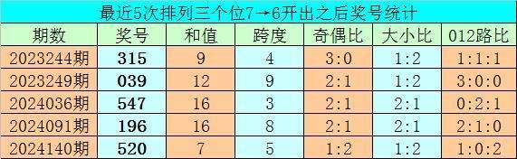 1、排列三前两期个位分别开出号码7和6,历史上个位号码连续两期分别出现7和6时,共有71次。在最近5次出现时,其下期分别出现号码:315、039、547、196、520;