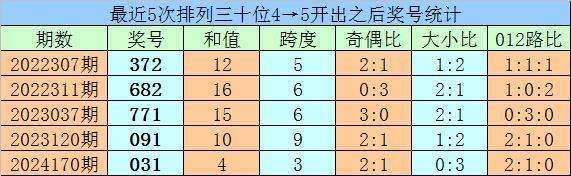 1、最近两期排列三十位号码开出号码分别为4和5,历史上十位号码连续两期同时出现号码4和5的奖号共开出65期。最近五次下期开出号码为:372、682、771、091、031;
