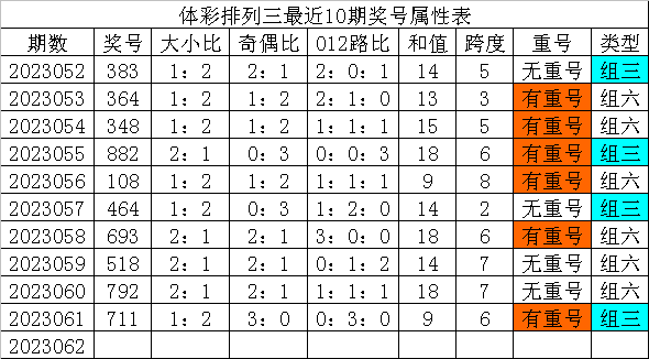 体彩排列三最近10期分别开出奖号:383、364、348、882、108、464、693、518、792、711,各奖号属性详见下表: