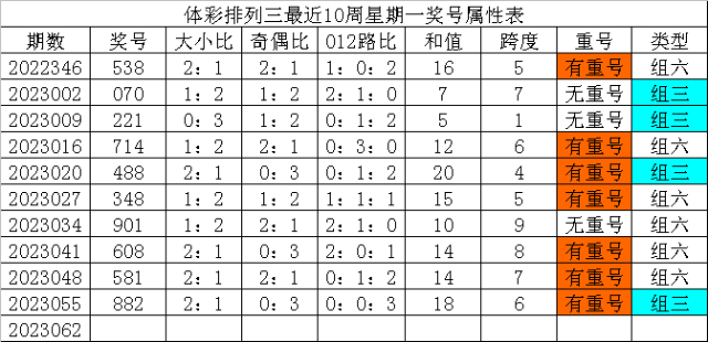 体彩排列三最近10周星期一奖号分别为:538、070、221、714、488、348、901、608、581、882,各奖号属性详见下表: