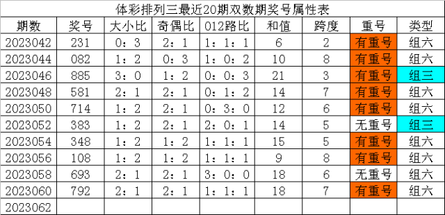 体彩排列三最近20期双数期奖号分别为:231、082、885、581、714、383、348、108、693、792,各期奖号详细属性下表: