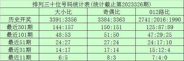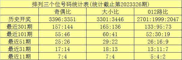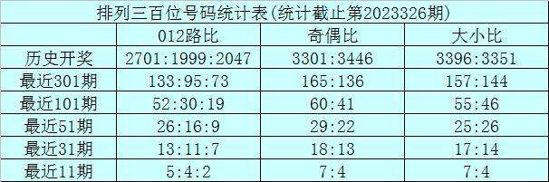 上期回顾:排列三第2023326期奖号为:790。奖号形态组六,大小比2:1,奇偶比2:1,012路2:1:0。