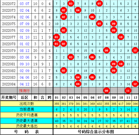 石浩第2022085期大乐透后区分析:后区上周星期三后区奖号为02和09,上期开出奖号04和12,最近9周星期三与最近9期后区奖号奇偶比分别为9:9和6:12,大小比分别为11:7和8:10,本期后区注意全大组合,参考号码08、10、11、12。