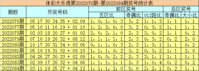 体彩大乐透第2022084期奖号为03 11 19 25 27 + 04 12,前区号码五区比为1:1:1:2:0,奇偶比为5:0,012路比为2:2:1,后区号码奇偶比为0:2,大小比为1:1。